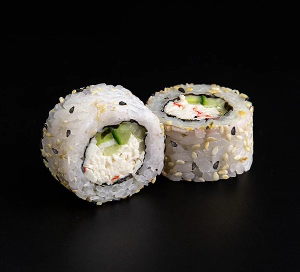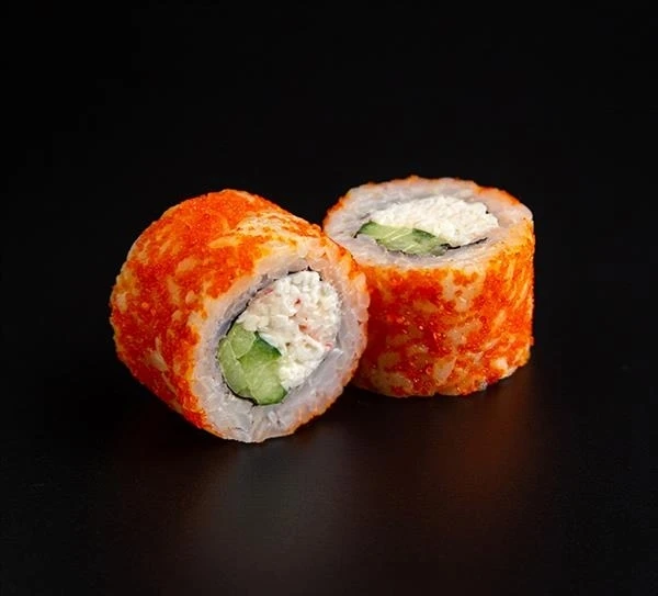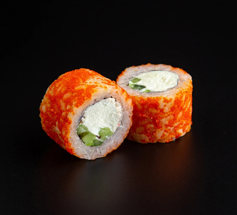 Тигровая креветка, сыр сливочный, огурец, икра масаго, рис, нори