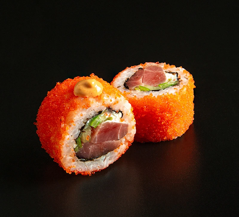 Тунец, сыр сливочный, огурец, икра масаго, соус Спайси (острый), рис, нори