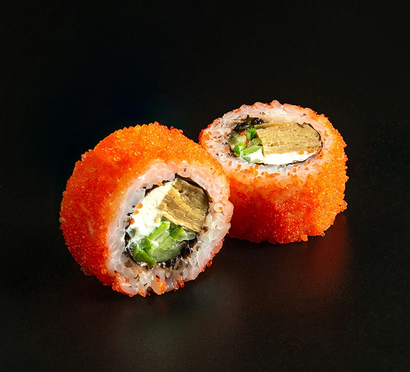 Лосось, тигровая креветка, сыр сливочный, огурец, соус Лава с креветкой (тигровая креветка, снежный краб, икра масаго, майонез), соус Унаги, маменори, рис, нори