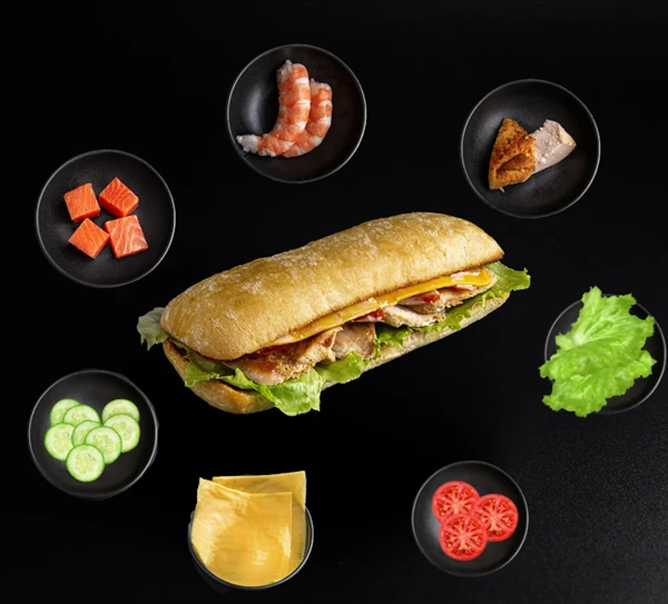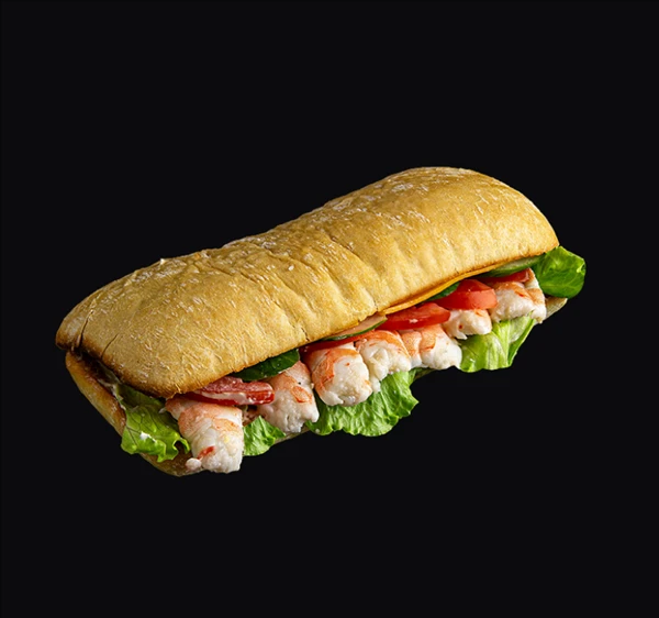 ПАНИНИ С КРЕВЕТКОЙ280 гБулочка для панини, тигровая креветка, салат Айсберг, огурец, помидор, сыр Чеддер, фирменный соус