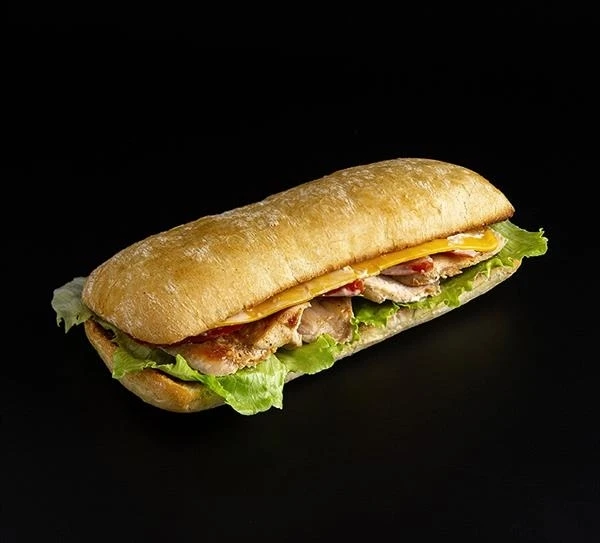 ПАНИНИ С КУРИЦЕЙ310 гБулочка для панини, куриное филе, салат Айсберг, огурец, помидор, сыр Чеддер, фирменный соус