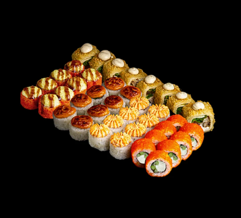 40 шт Тортилья с курицей темпура, Курица спайси запеченный, Запеченная калифорния, Сливочная калифорния, Лава краб - соевый соус, имбирь и васаби НЕ ВХОДЯТ в комплект (добавить в заказ в разделе "Допы")