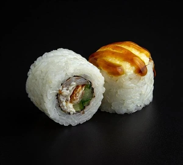 8 шт Угорь, сыр сливочный, огурец, соус Сырный (майонез, сыр Пармезан), соус Унаги, кунжут, рис, нори - соевый соус, имбирь и васаби НЕ ВХОДЯТ в комплект (добавить в заказ в разделе "Допы")