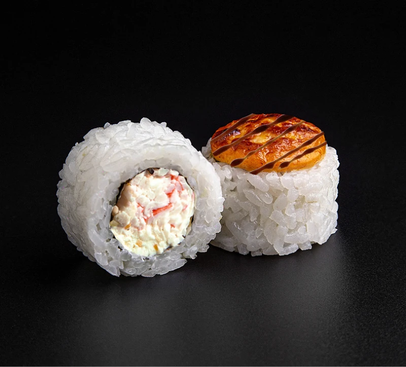 8 шт Снежный краб, сыр сливочный, соус Сырный Спайси (острый), соус Унаги, рис, нори - соевый соус, имбирь и васаби НЕ ВХОДЯТ в комплект (добавить в заказ в разделе "Допы")