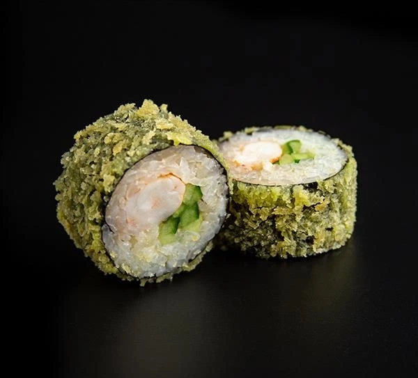 Тигровая креветка, огурец, соус Лава, лук зеленый, кляр, сухари Панко, рис, нори