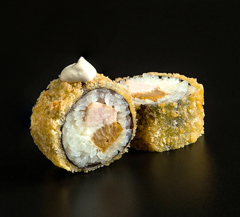 Куриное филе, омлет Тамаго, сыр сливочный, соус Цезарь, кляр, сухари Панко, рис, нори